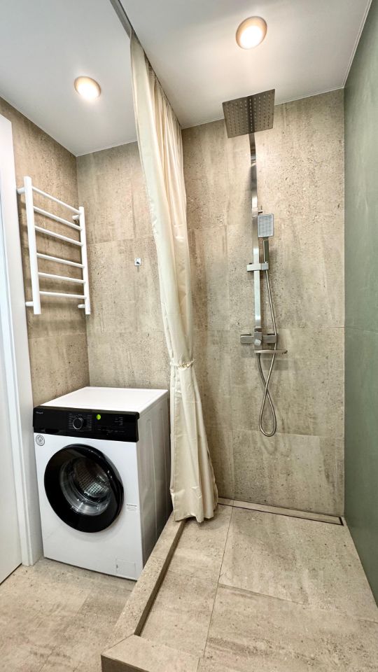 В квартире есть всё необходимое для комфортного проживания: современная мебель как на кухне, так и в комнате, а также полный комплект техники, включая холодильник, посудомоечную машину, телевизор и стиральную машину. Санузел совмещенный, оборудован душевой кабиной. Окна выходят во двор, поэтому в квартире всегда тихо и спокойно.