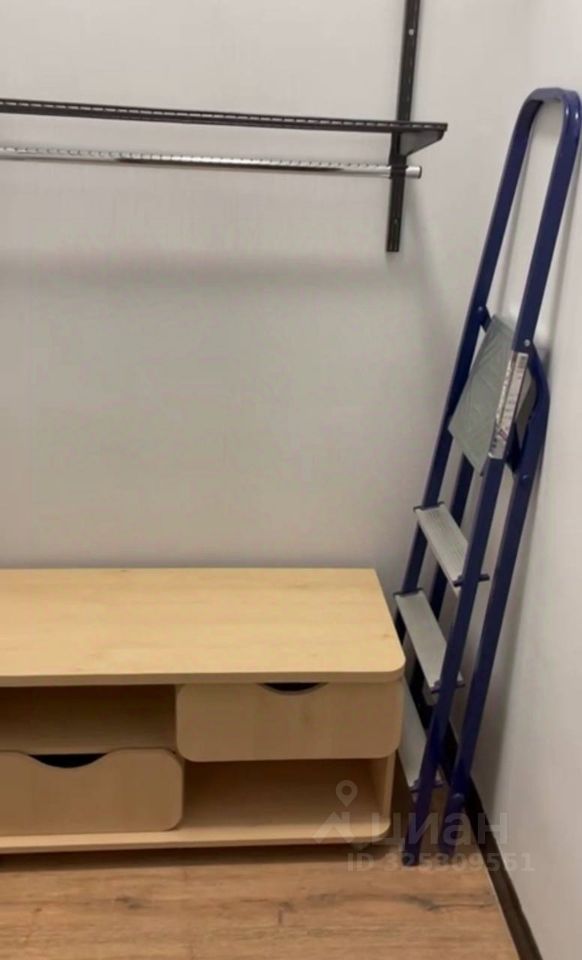 В комнате установлен вместительный шкаф, кровать, тумбы и полки, а также имеется изолированная вместительная гардеробная.