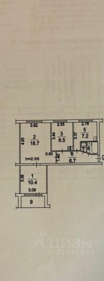 Жилая площадь 37.6 м2, кухня 7.2 кв.м., площадь комнат: 18.7/10.4/8.5 м2, комнаты смежно-изолированные.