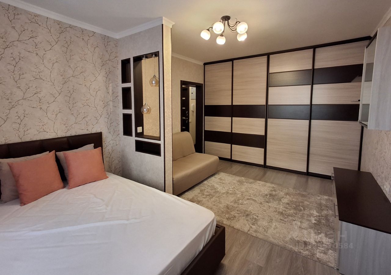 Комната зонирована на спальню и диванную зону, продуманы системы хранения, встроенная кухня.