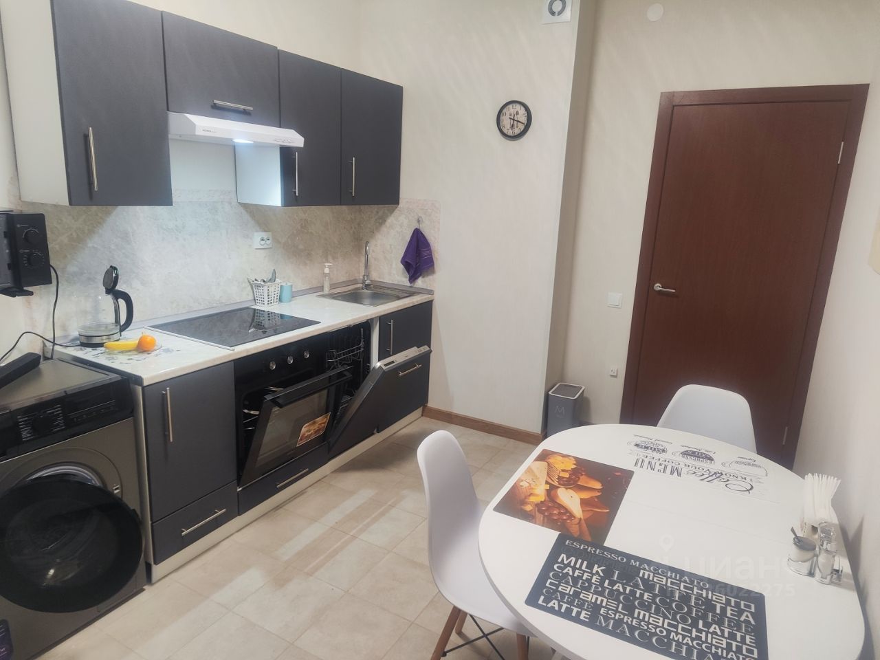 Бытовая техника включает микроволновую печь, посудомоечную машину, стиральную машину, холодильник, встроенную варочную панель, духовой шкаф, вытяжку и чайник (все НОВОЕ).