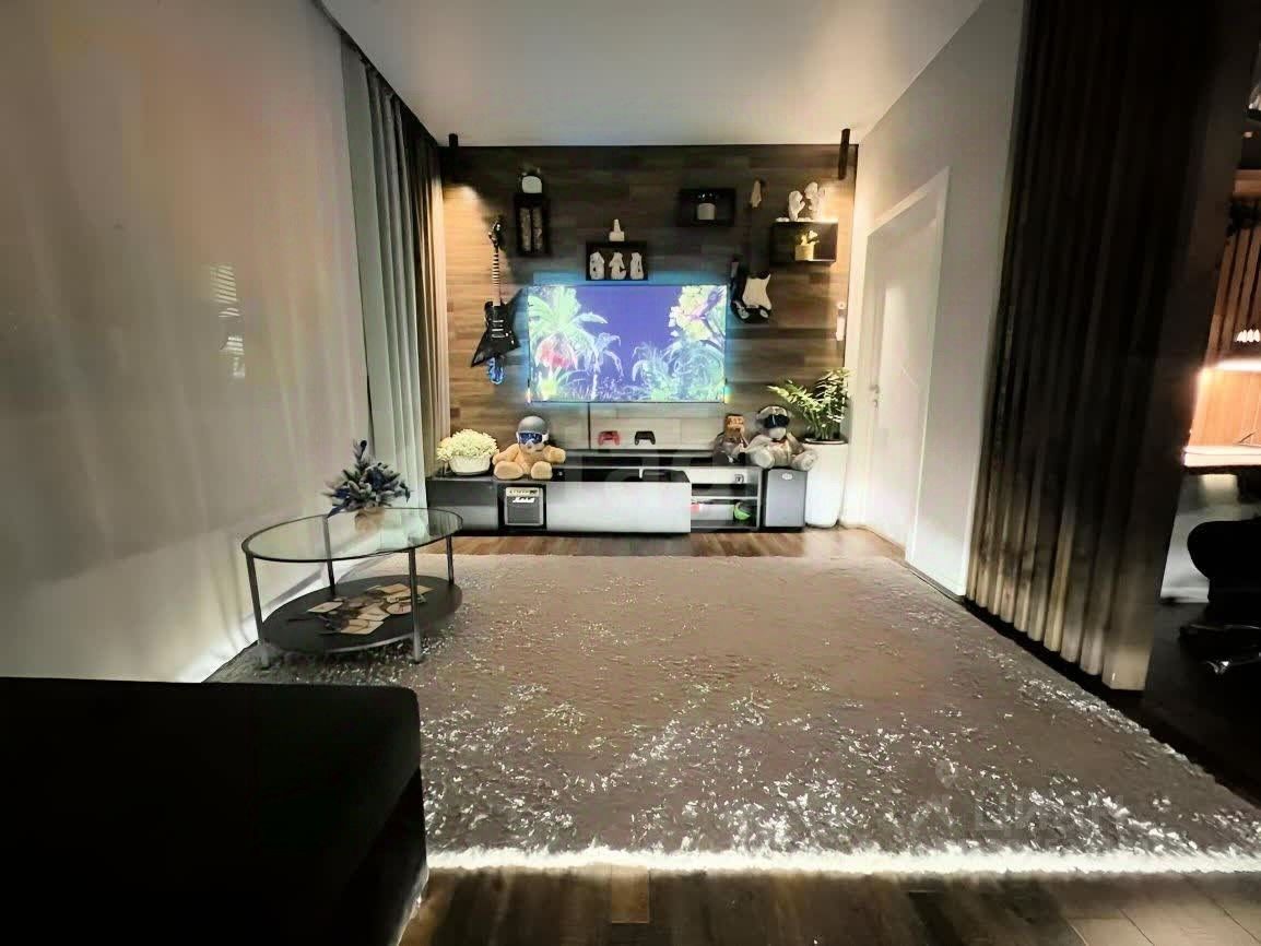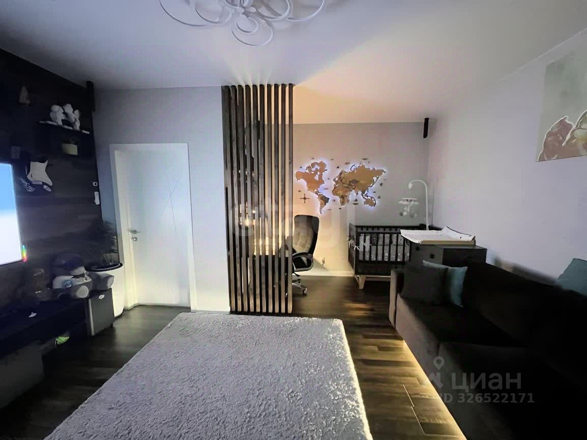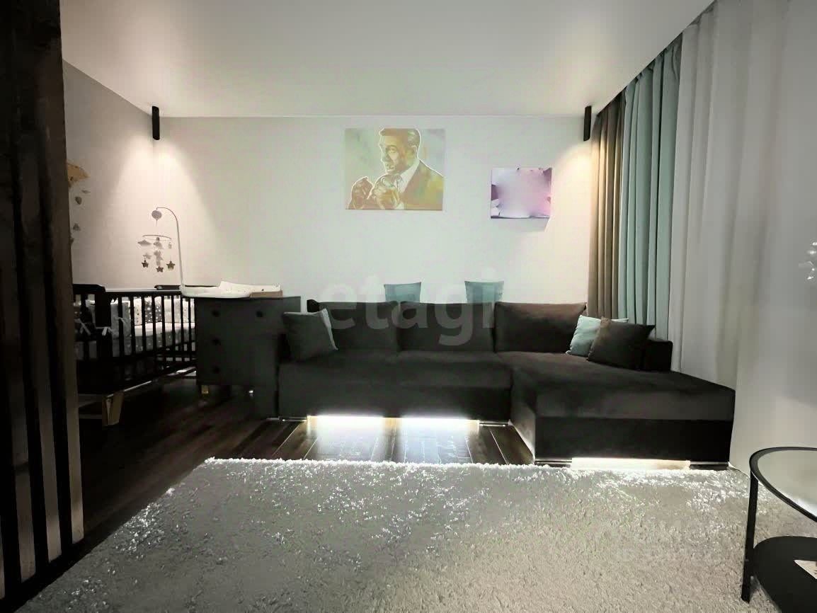 Просторная гостиная 19.3 м2: окна выходят во двор. ТВ зона выложена ламинатом, под диваном сделана подсветка, которая придает вечером особый уют комнате. Помимо основного света, на потолке есть ночные светильники по углам комнаты. Уютное рабочее пространство огороженое рейками.