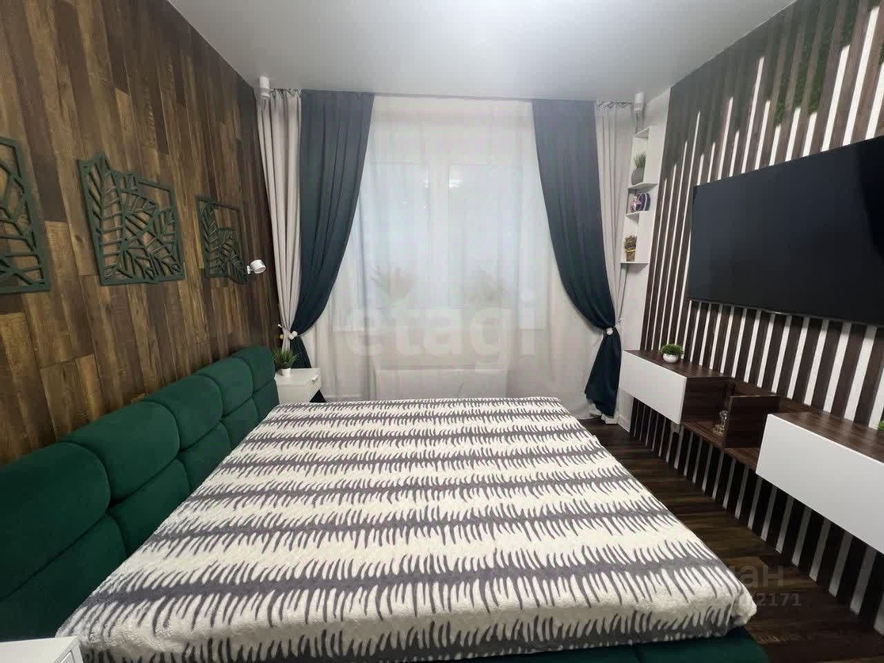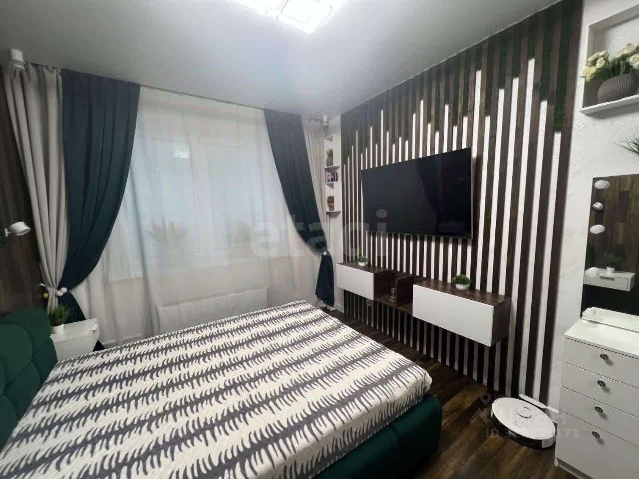 Спальня 12.3 м2: разные типы освещения, основной, ночной разных цветов (люстра на пульте), ночной по углам окон, а так же 2 светильника над кроватью. ТВ зона украшена декоративными рейками и зеленью. Кровать с подъемным механизмом. Окна выходят на внешнюю сторону дома.