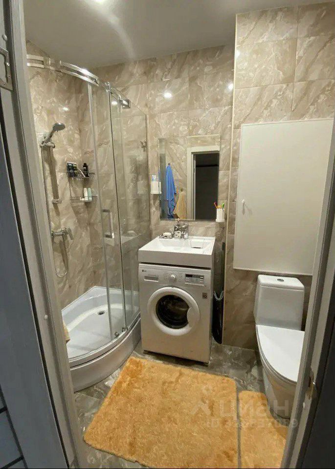 Санузел совмещенный, оснащен душевой кабиной и стиральной машиной. Из мебели имеются шкафы и обеденный стол. Лоджия добавляет дополнительное пространство для отдыха.