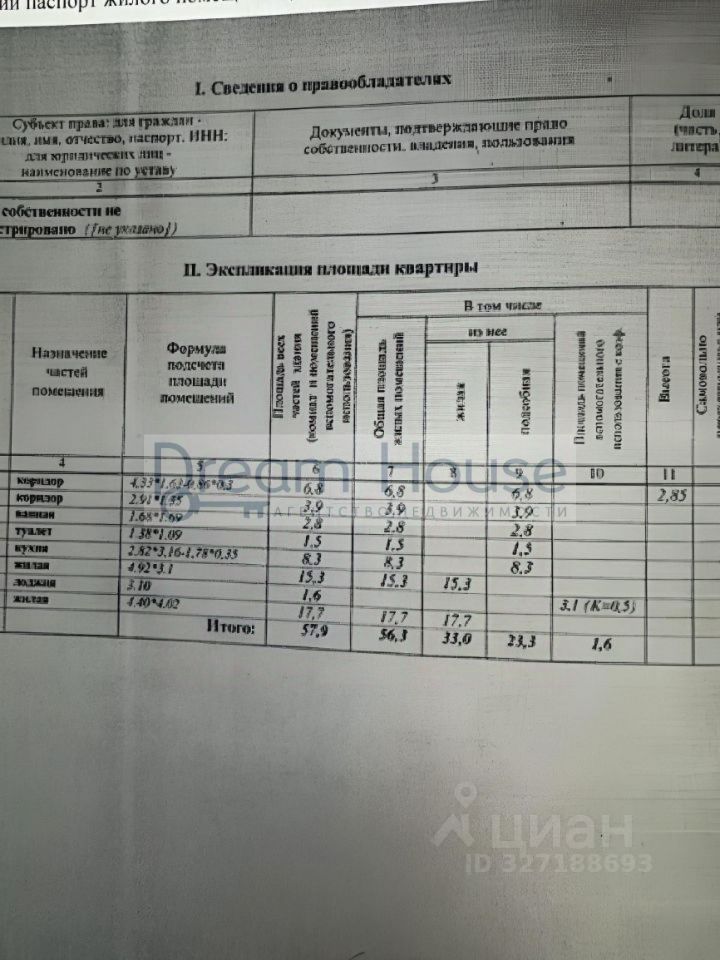 -общая площадь 56,3 м2 -жилая площадь 33 м2 -комнаты 17.3, 15.3, м2 -кухня 8,3 м2 -санузел раздельный -высота потолков 2,85 м
